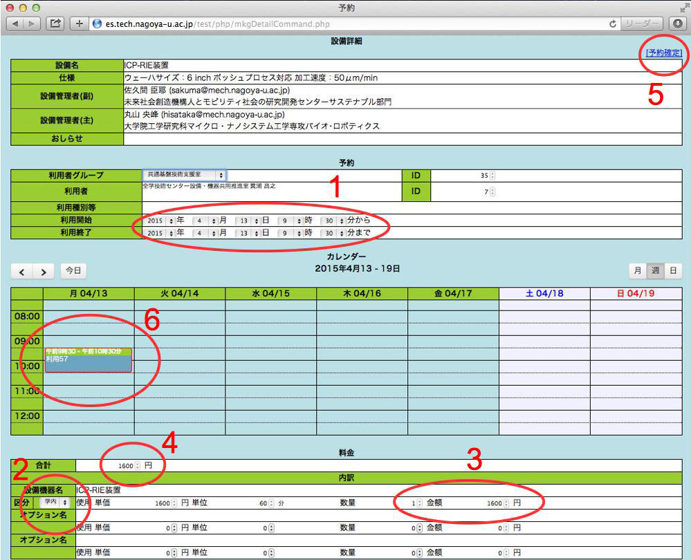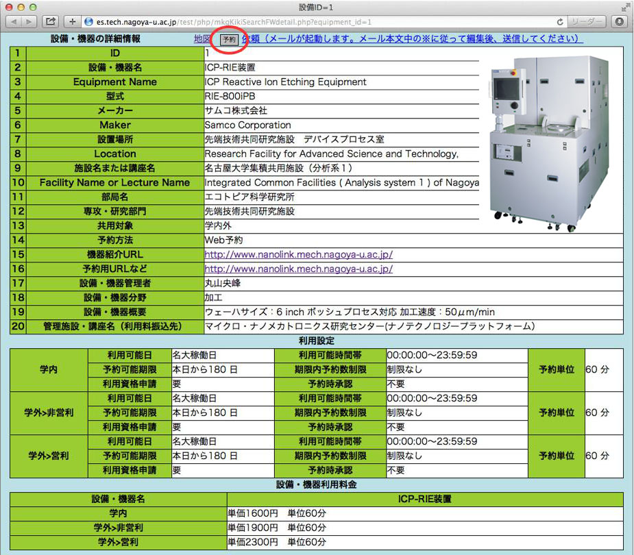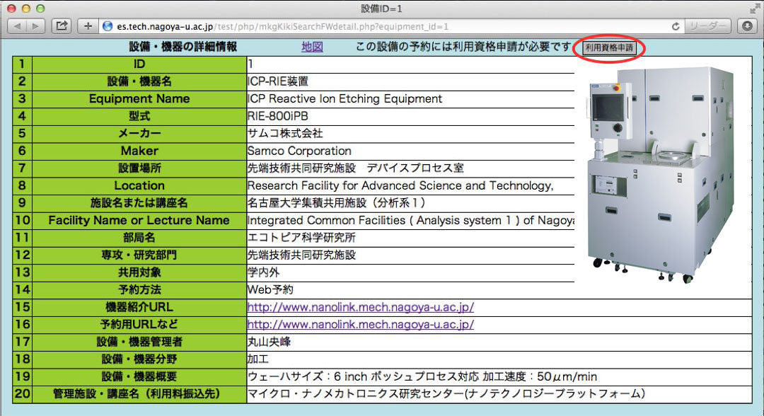 共用機器において利用前に利用資格申請が必要な機器については、上段に「利用資格申請」ボタンが表示されます。ボタンをクリックすると利用資格申請が機器の管理者にメールで届きます。機器管理者から承認メールが届くと機器の予約が出来るようになります。