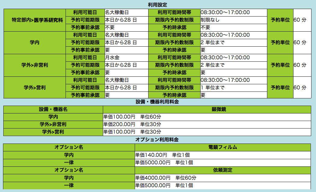 設備・機器の利用料金は、個々の設備・機器によって異なった料金が設定されています。また、利用者の利用区分で学内、学外、さらには学外営利・非営利といった設定もあります。機器によっては特定部内、学部研究科内のみに対応する料金設定もあります。ログインしている利用者につきましては利用区分で最安価の料金になるように設定されます。